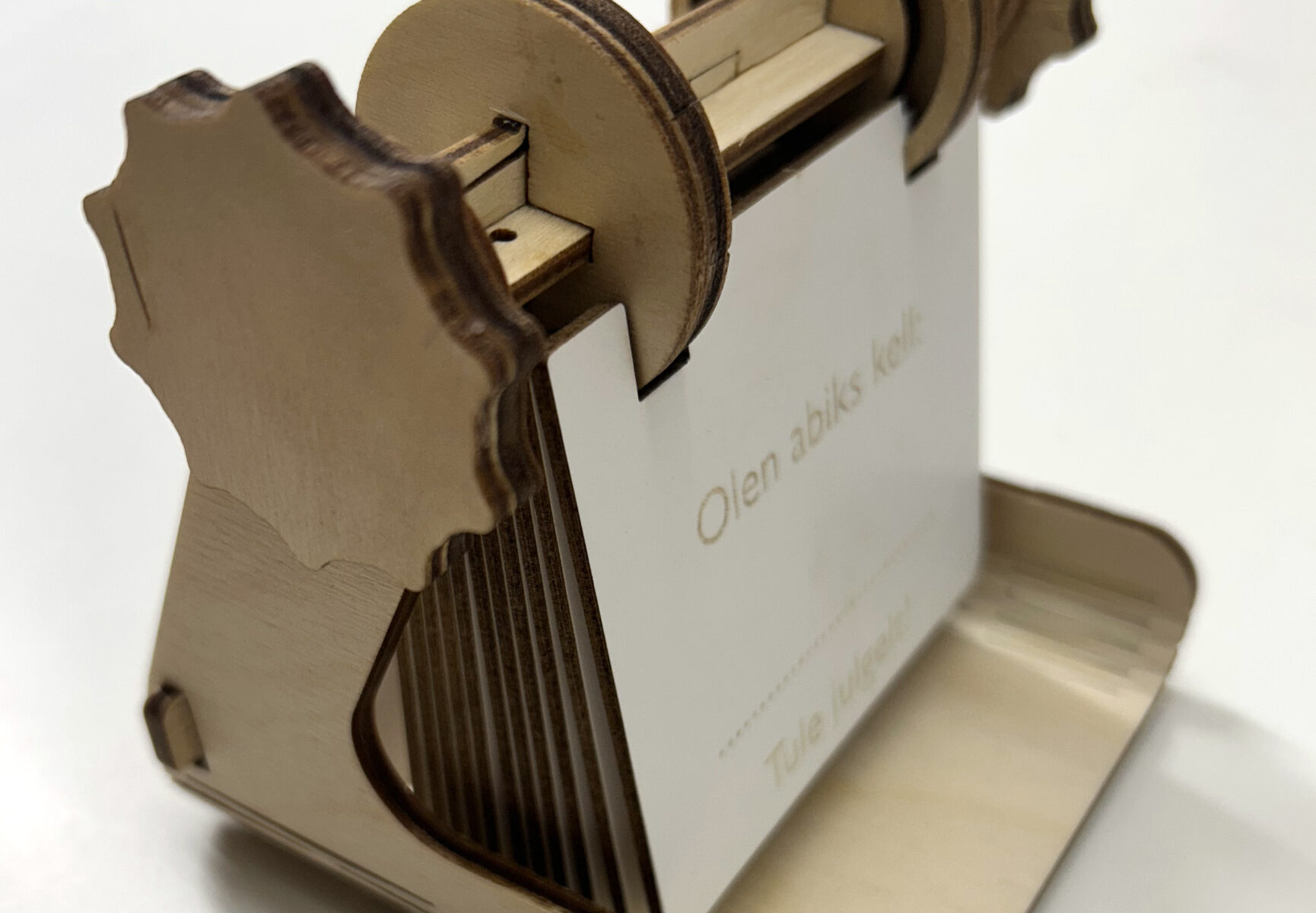 Seejärel alustasin 3D-mudeli loomisega. Esimesed mudelid õnnestus tänu KOOR Woodi meistritele kiiresti laseriga vineerist välja lõigata, kokku panna ja proovida. Suurt tähelepanu sai toote kokkupanemise lihtsus. Iga viimset kui detaili katasin ja muutsin korduvalt, kuni jõudsin rahuldava tulemuseni.